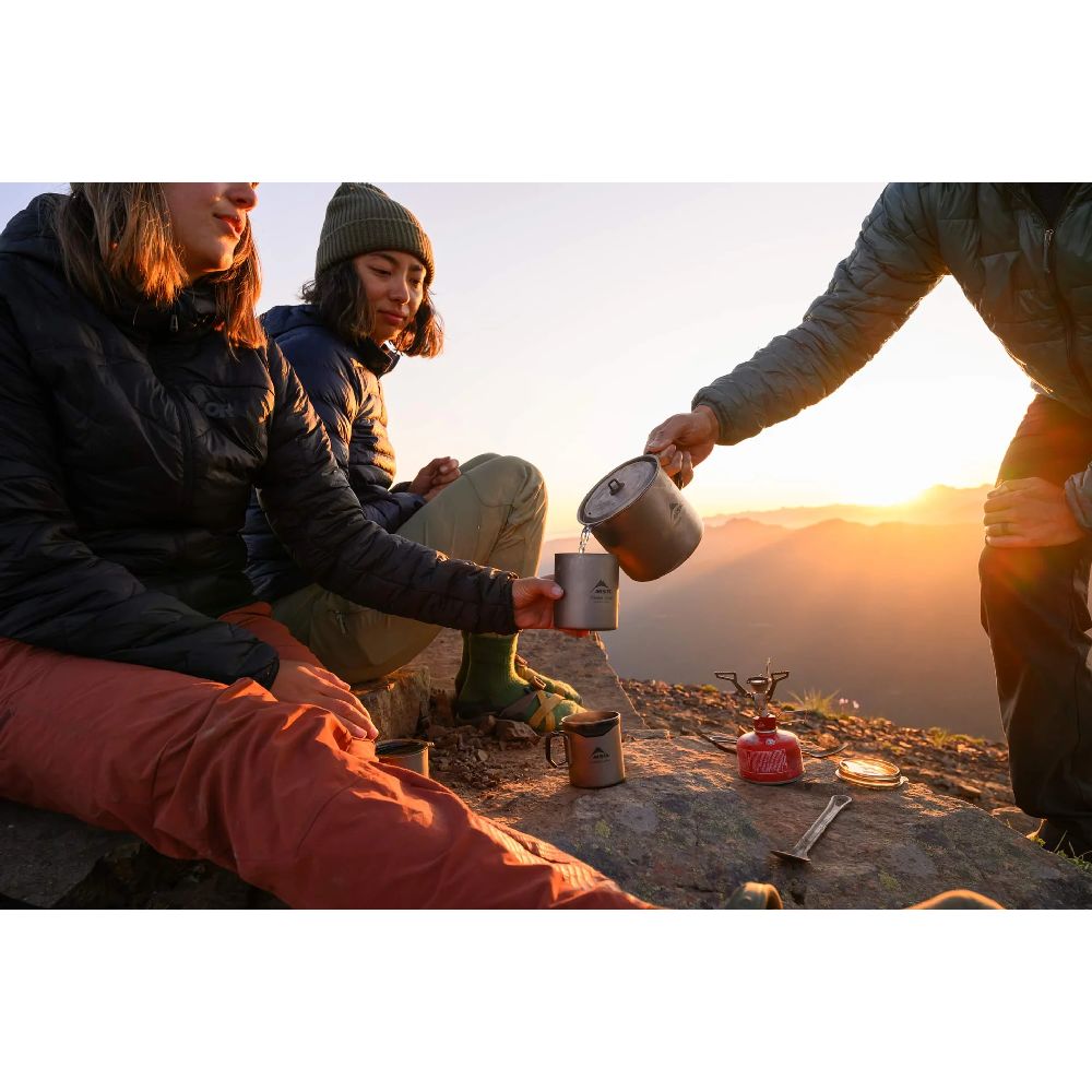 The MSR Titan Kettle is the ideal ultralight titanium cook pot for backcountry pairs seeking exceptional durability without weight penalty. Constructed from premium titanium that offers twice the strength of aluminium at half the weight of steel, this versatile kettle features an improved spout design for effortless pouring, silicone-coated folding handles, and interior graduation marks for precise measurements. The snug-fitting lid includes an innovative silicone hook that hangs cleanly off the pot rim, whilst the generous 1.4 litre capacity accommodates meals for two adventurers. At just 153g, this kettle nests perfectly with other MSR Titan cookware and can store an 8oz fuel canister with a PocketRocket stove inside.
